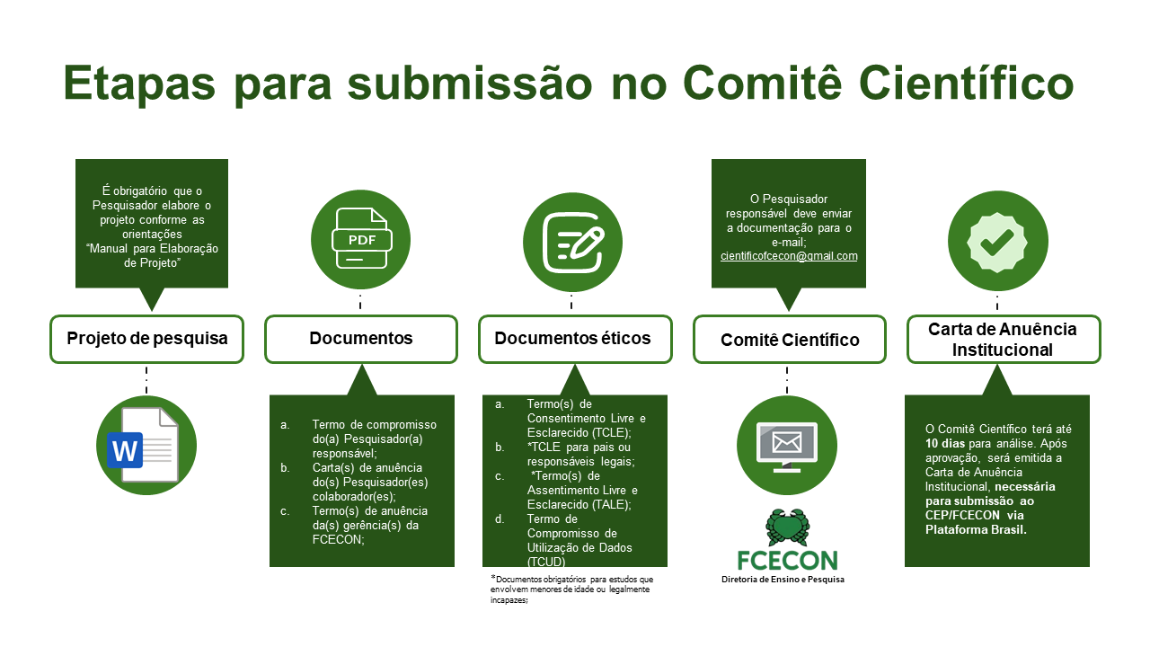- O pesquisador responsável, após reunir toda a documentação necessária, deverá encaminhá-la para análise do Comitê Científico Institucional da FCECON, por meio do email: cientificofcecon@gmail.com;